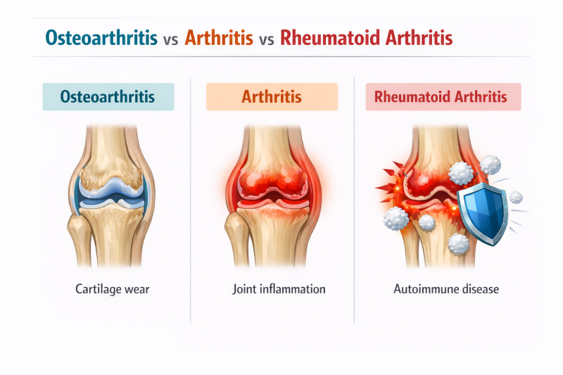 L’Arthrose (plus fréquente) est due à l’usure, tandis que l’Arthrite rhumatoïde est une maladie auto-immune.